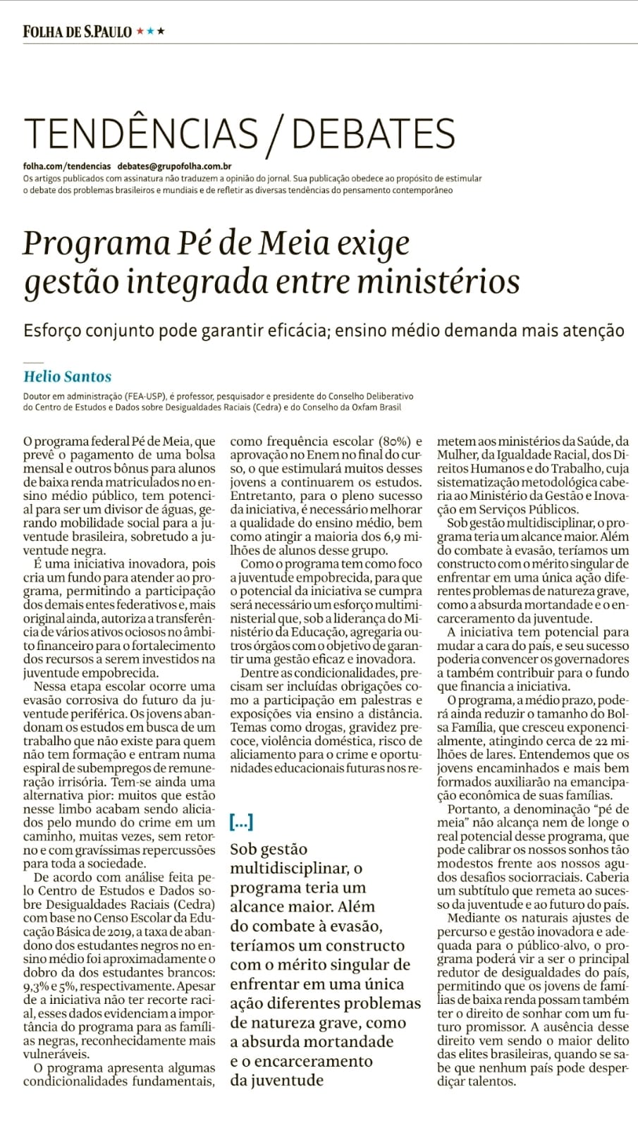 Artigo de Helio Santos, diretor do Conselho Deliberativo do Cedra, sobre o Programa Pé de Meia.