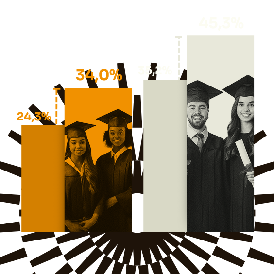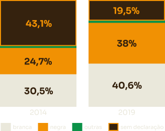 EscolaridadeEm 2014, a proporção de ingressantes brancos nas graduações (presencial + a distância; pública + privada) foi de 30,5% e a de negros, 24,7%. Em 2019, os brancos foram 40,6% e os negros, 38,0%. Houve um aumento maior de negros que de brancos no período – 13,3 pp e 10,1 pp, respectivamente.