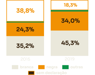 EscolaridadeA proporção de negros que concluíram a graduação em instituições privadas passou de 24,3% para 34,0% entre 2015 e 2019. No caso dos brancos, foi de 35,2% para 45,3%. A diferença entre negros e brancos aumentou de 10,9 pontos percentuais (pp) para 11,3 pp – a desigualdade se manteve praticamente inalterada.
