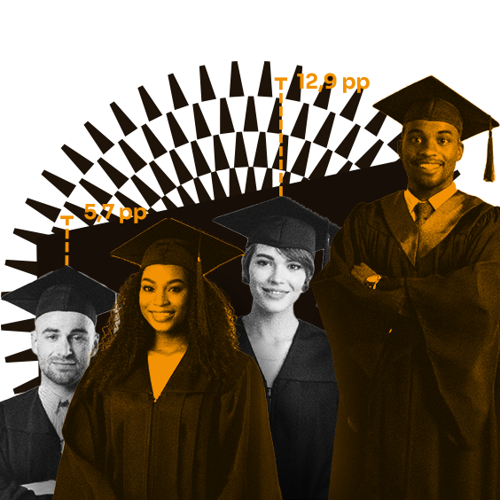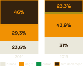 EscolaridadeEm 2014, a proporção de ingressantes brancos nas graduações (presencial + a distância; pública + privada) foi de 30,5% e a de negros, 24,7%. Em 2019, os brancos foram 40,6% e os negros, 38,0%. Houve um aumento maior de negros que de brancos no período – 13,3 pp e 10,1 pp, respectivamente.