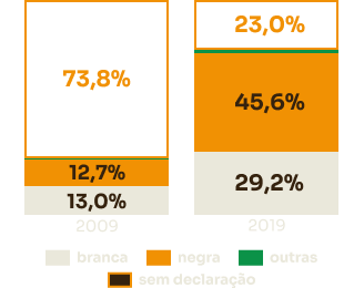 EscolaridadeApesar da redução de 51,5 pontos percentuais entre 2010 e 2019, a falta de declaração de cor-raça dos estudantes de graduação permaneceu relativamente alta.