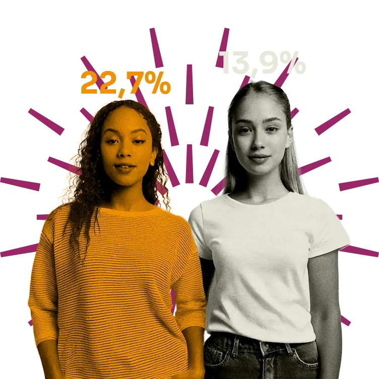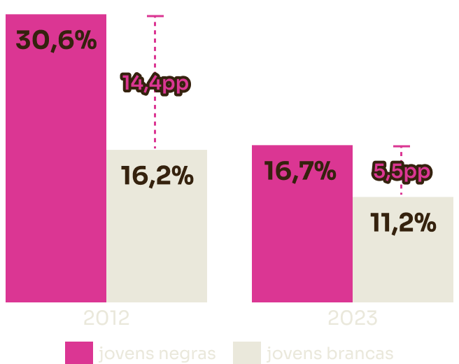 EscolaridadeReduziu a taxa de mulheres negras de 20 a 29 anos que concluíram até o Ensino Fundamental de 21,8% para 18,3%. As brancas reduziram de 14,3% para 12,3%, entre 2012 e 2019. A distância entre brancas e negras praticamente não se modificou.
