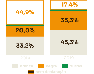 EscolaridadeNas graduações presenciais em Pedagogia nas instituições públicas em 2014, a proporção de negros era 9,6 pontos percentuais (pp) maior que a de brancos. Já em 2019, essa diferença passou para 21,5 pp. Nas instituições privadas, a proporção de negros era 1,7 pp maior que a de brancos em 2014, passando para 5,2 pp em 2019.