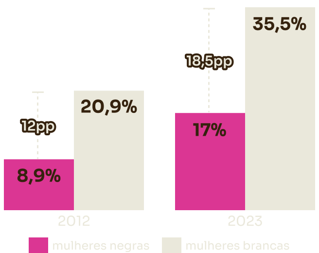 EscolaridadeEm 2012, entre pessoas negras de 15 a 19 anos, 36,6% não tinham instrução ou possuíam Ensino Fundamental incompleto, contra 20,8% das brancas. Em 2023, negras eram 19,8% e brancas 12,5%, reduzindo a diferença de 15,8 para 7,3 pontos percentuais. Apesar do avanço, era expressivo o percentual de jovens, sobretudo negros, com esse baixo nível educacional.