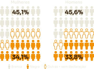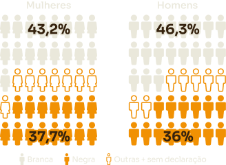 Entre os brancos, com 15 anos ou mais, 38,8% dos homens não tinham instrução ou tinham o fundamental incompleto. Já entre as mulheres brancas na mesma faixa etária, 36,4% tinham esse mesmo grau de escolaridade.
