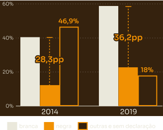 EscolaridadeEm 2014, havia mais brancos que negros de 19 a 24 anos, matriculados nos cursos de graduação pública e o oposto na faixa com 41 anos ou mais. Em 2019, as proporções de brancos e negros eram similares na faixa de 19 a 24 anos, porém com 41 anos ou mais permaneceu um percentual maior de negros do que de brancos.