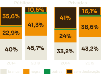 EscolaridadeSomadas as matrículas nas graduações em Pedagogia em instituições públicas e privadas, havia 26,1% de brancos e 24,4% de negros em 2014. Já em 2019, havia 36,5% de brancos e 42,6% de negros, indicando uma inversão da predominância anterior. A declaração de cor-raça passou a ser maior que 50% a partir de 2014.
