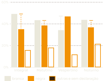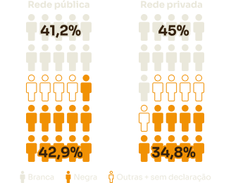 EscolaridadeDo total de estudantes mulheres que concluíram a graduação em instituições públicas, em 2019, 43,2% eram brancas, 37,7%, negras e 16,7%, sem declaração de cor-raça. Já entre os homens, 46,3% eram brancos, 36,0%, negros e 15,3%, sem declaração de cor-raça.