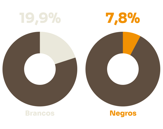 Em 2010, na faixa etária de 18 a 24 anos, 19,9% de brancos frequentavam o Ensino Superior, enquanto que entre negros essa proporção era de 7,8%.