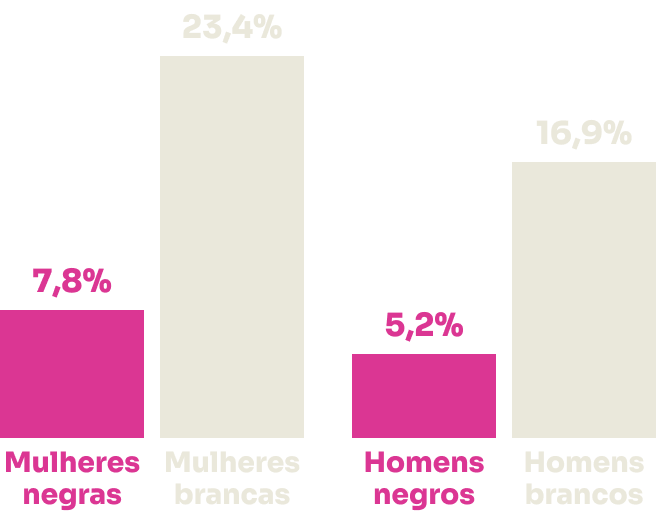 EscolaridadeA taxa da população entre 25 a 29 anos com Ensino Superior completo em 2010 era 23,4% entre as mulheres brancas, 7,8% entre as mulheres negras, 16,9% entre os homens brancos e 5,2% entre os homens negros.